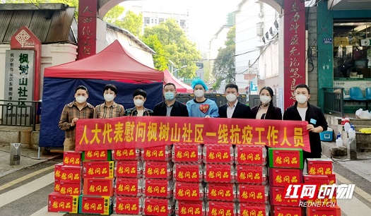 4月6日下午,長沙市人大代表聶志強(qiáng)(右三)和其他幾位代表在雨花區(qū)東塘街道楓樹山社區(qū)開展慰問。