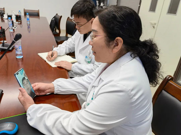 全國人大代表、南昌大學(xué)第一附屬醫(yī)院院長張偉為患者進(jìn)行遠(yuǎn)距離視頻問診。(江西省人大常委會供圖)