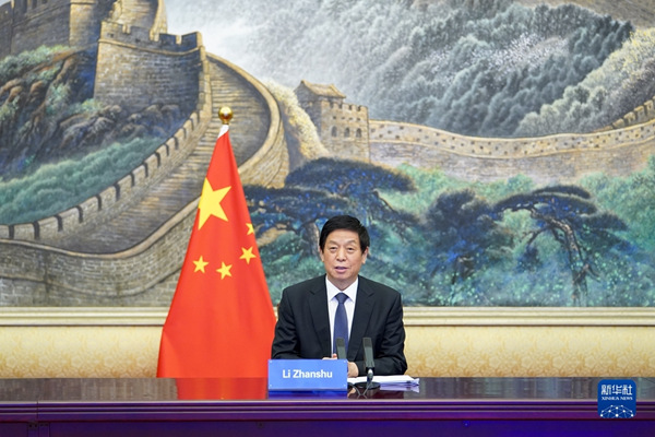 6月28日,全國人大常委會委員長栗戰(zhàn)書在北京人民大會堂以視頻方式同哈薩克斯坦議會下院議長科沙諾夫舉行會談。新華社記者 殷博古 攝