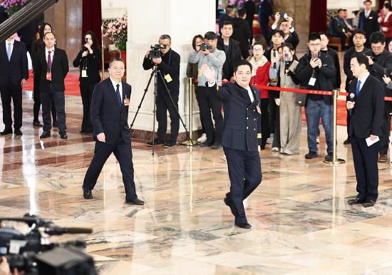 圖① 3月9日,十四屆全國(guó)人大四次會(huì)議第二場(chǎng)“代表通道”集中采訪活動(dòng)在北京人民大會(huì)堂舉行,代表一邊走向通道一邊向記者揮手。