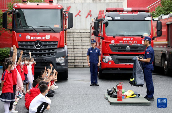 “六一”兒童節(jié)臨近,湖南省資興市消防救援大隊舉辦開放日活動,資興市小紅花幼兒園30余名小朋友走進消防站,參觀了解消防裝備,學習消防知識,增強安全意識。新華社發(fā)(李科攝)