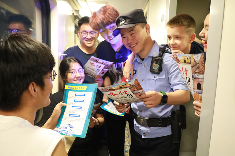 隨著暑期“新疆游”持續(xù)升溫,烏魯木齊鐵路公安局庫爾勒公安處乘警支隊(duì)以夏季治安打擊整治行動(dòng)為契機(jī),開展打造平安列車專項(xiàng)行動(dòng),全力確保旅客平安出行。圖為7月30日,乘警在旅游專列上向游客宣講乘車安全常識(shí)并介紹新疆旅游資源及風(fēng)土人情。