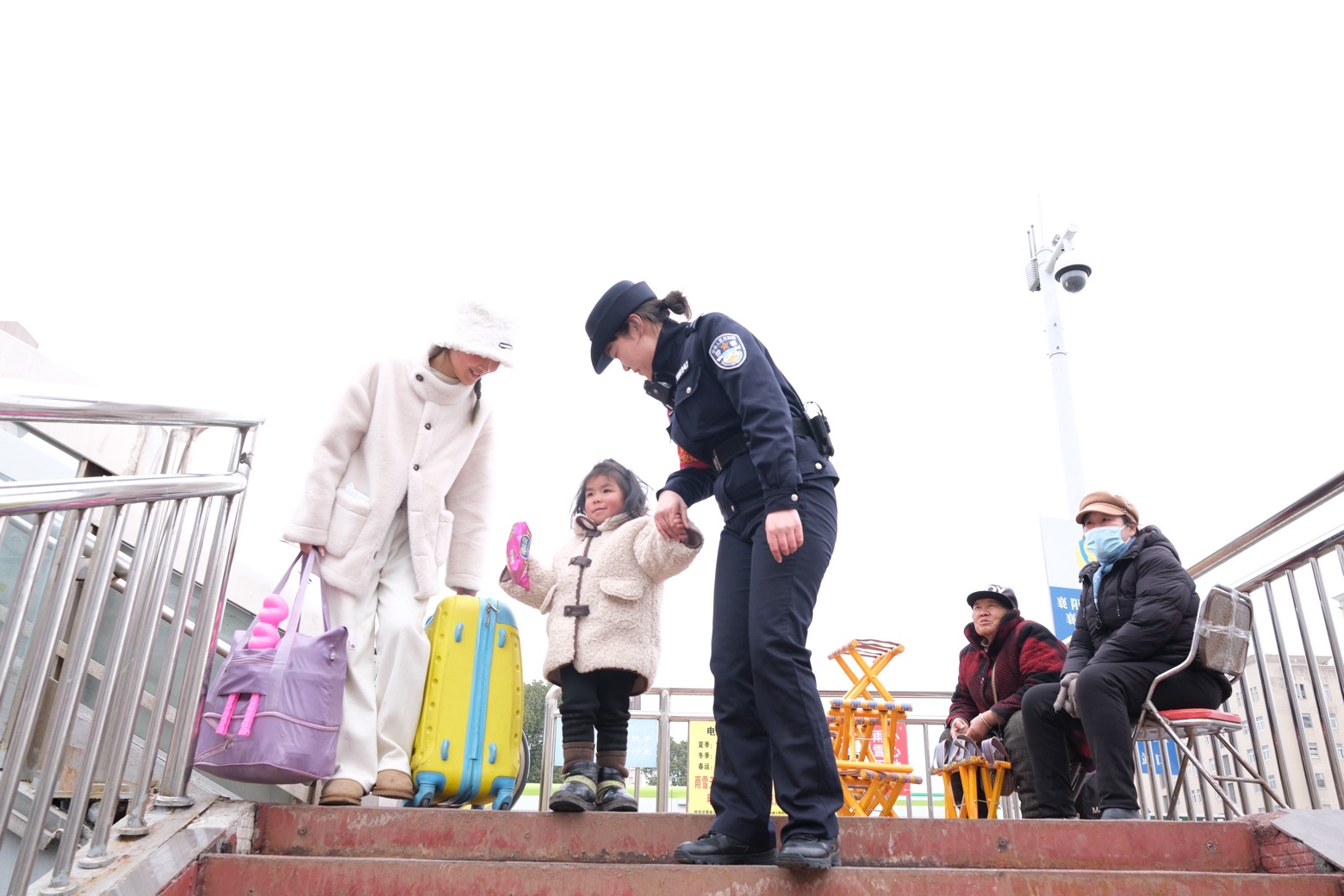 近日,湖北省普降大雪。為確保廣大旅客安全出行,襄陽鐵路公安處乘警支隊與襄陽車站派出所積極做好車站及列車秩序維護工作,保障旅客生命及財產(chǎn)安全。圖為2月26日,民警幫助一位帶小孩的女士進站乘車。