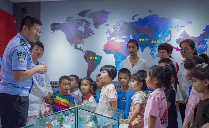 近日,新疆伊犁邊境管理支隊(duì)可克達(dá)拉邊境派出所在轄區(qū)禁毒教育基地,運(yùn)用VR體驗(yàn)、全息成像、人工智能等高科技手段,為轄區(qū)幼兒園的小朋友們上了一堂生動的禁毒宣傳教育課。圖為民警為孩子們介紹毒品的危害性。