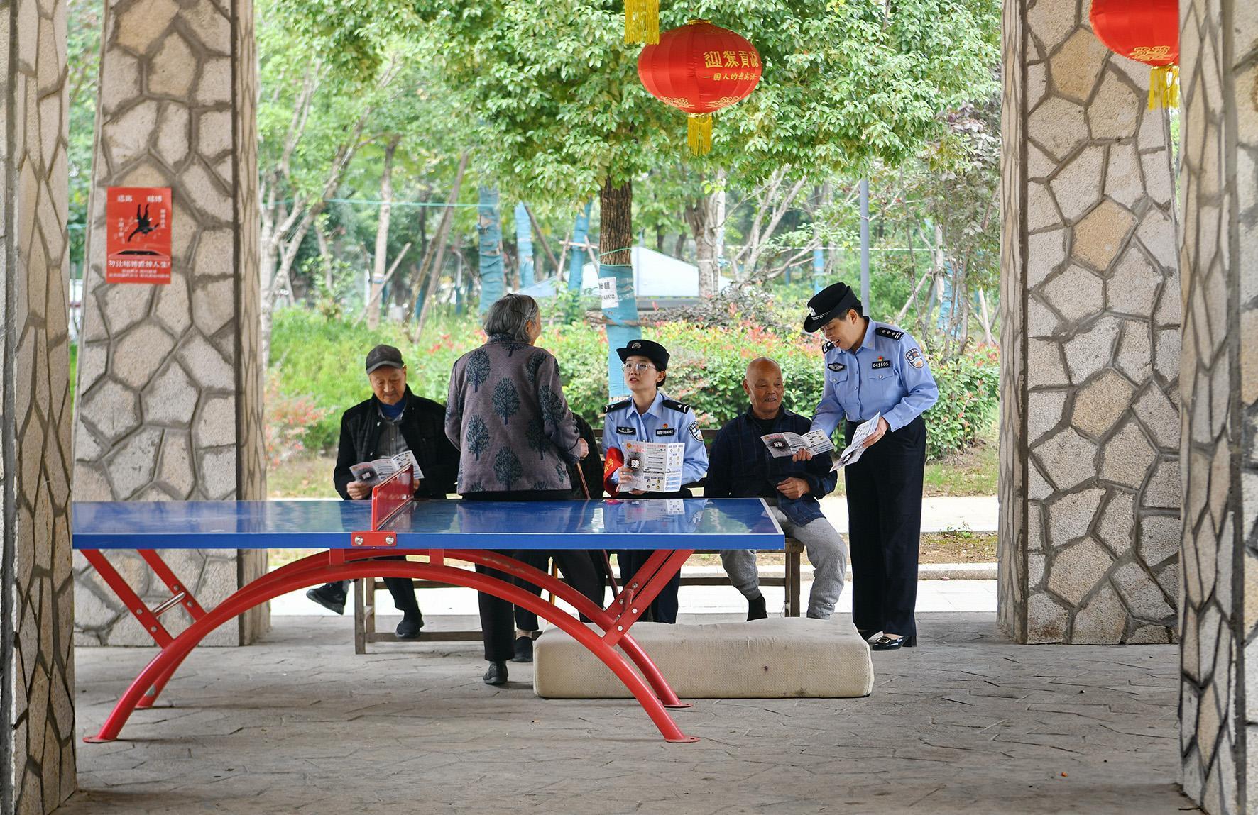 10月10日,安徽省阜南縣公安局治安大隊民輔警在鹿城鎮(zhèn)白果社區(qū)向群眾普及防范詐騙法律常識。