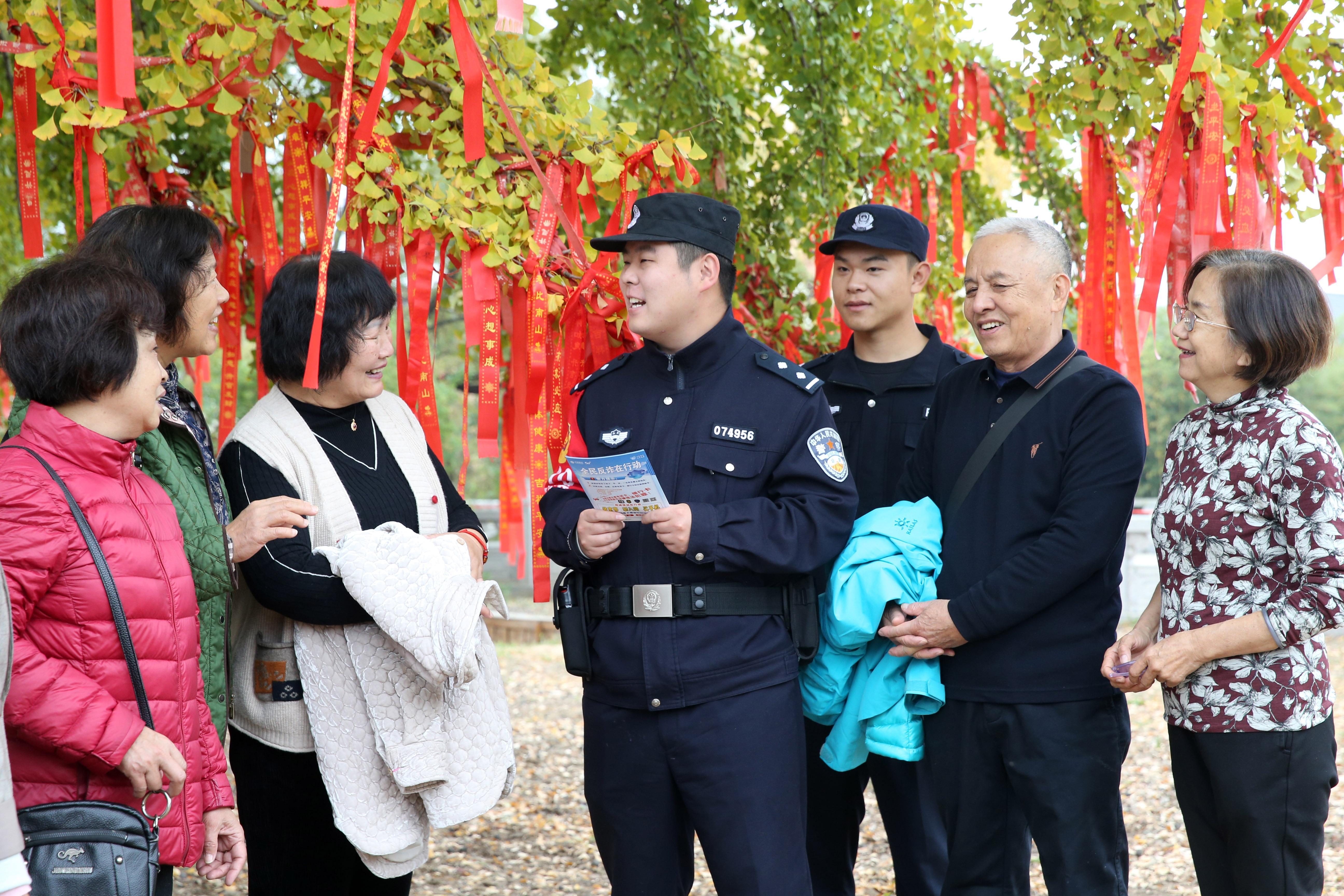 近日,山東省臨沂市郯城縣新村銀杏開發(fā)區(qū)內(nèi)的三千年古銀杏樹進(jìn)入最佳觀賞期,吸引眾多游客前來打卡。郯城縣公安局新村派出所民警來到景區(qū)開展反詐宣傳活動(dòng),提高游客的防詐意識(shí)。圖為十一月十日,民警向游客普及反詐知識(shí)。