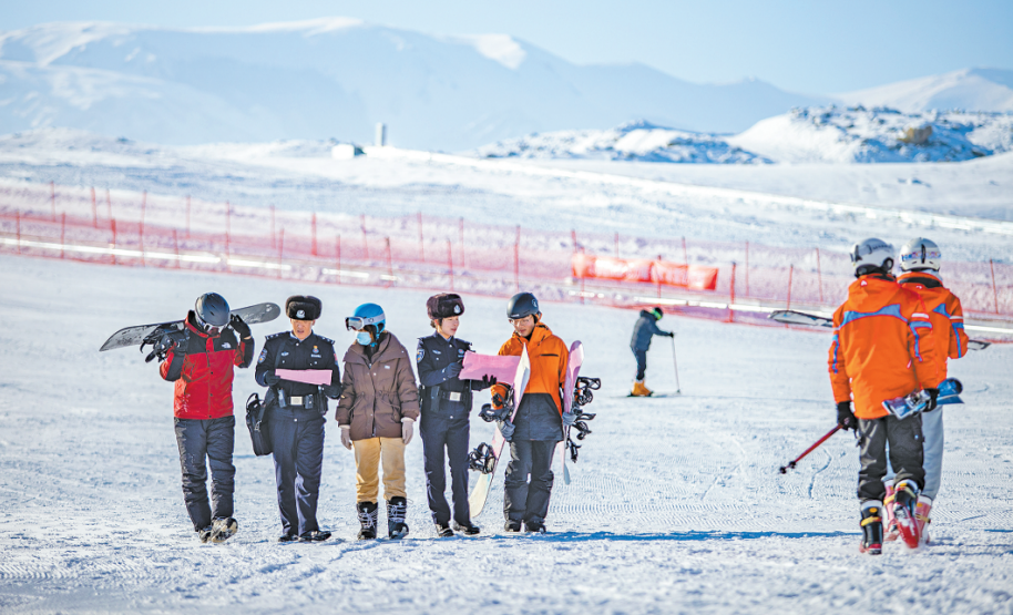 近日,新疆博州邊境管理支隊(duì)扎勒木特邊境派出所對轄區(qū)滑雪場開展安全檢查,開展應(yīng)急救援演練、雪具用品抽查等工作,及時(shí)排查各類安全隱患。圖為民警向游客開展滑雪安全宣傳教育。