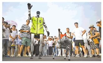 圖為杭州西湖斷橋上,西湖景區(qū)公安AI警隊隊員人形機器人協(xié)同機器狗同步現身。 王剛 攝
