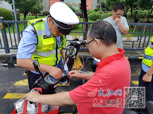 “同志,請把這張?zhí)嵝褬撕炠N在你電動自行車的前面,時刻提醒你戴上頭盔?!?月5日,南昌市紅谷灘區(qū)鳳凰南大道上,紅谷灘交警大隊二中隊民警李黎正在勸導(dǎo)騎電動自行車的市民佩戴頭盔。除了對未佩戴頭盔的車主進行警示教育外,他還在每輛電動自行車顯眼位置貼上提醒標簽。