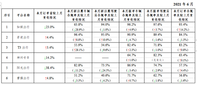 一、在訂單量超過30萬單的網(wǎng)約車平臺中,訂單合規(guī)率最高的是如祺出行,最低的是方舟行。2021年6月訂單量超過30萬單的網(wǎng)約車平臺共13家。與5月份相比,招招出行、東風(fēng)出行從5月訂單量超過30萬單降到30萬單以下。按訂單合規(guī)率(指駕駛員和車輛均獲得許可的訂單量占比)從高到低的分別是如祺出行、享道出行、T3出行、神州專車、陽光出行、曹操出行、首汽約車、幫邦行、滴滴出行、萬順叫車、美團(tuán)打車、花小豬出行、方舟行。本月訂單合規(guī)率增長排名前3名的分別是如祺出行、方舟行、花小豬出行;下降最多的分別是曹操出行、享道出行、美團(tuán)打車。