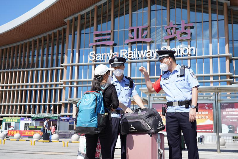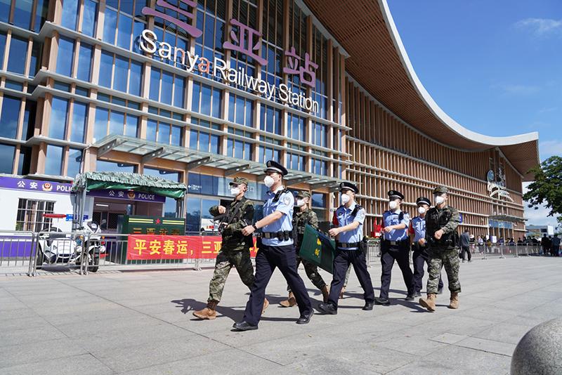 圖為三亞站派出所民警在站前廣場巡邏。