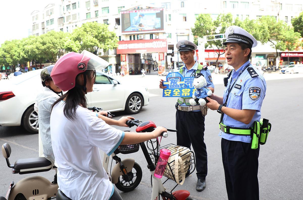 圖為7月10日,民警通過(guò)問(wèn)答互動(dòng)方式宣傳“三零一戴”,并向群眾贈(zèng)送“交警小熊”。