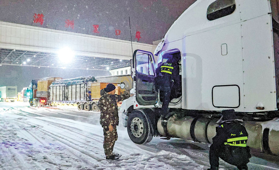 12月7日晚,內(nèi)蒙古自治區(qū)滿洲里市遭遇強降雪天氣,氣溫降至零下30攝氏度,滿洲里出入境邊防檢查站迅速啟動應(yīng)急預(yù)案,加強口岸管控力度,強化重點區(qū)域巡查,確保口岸通關(guān)安全有序。(李發(fā)春)