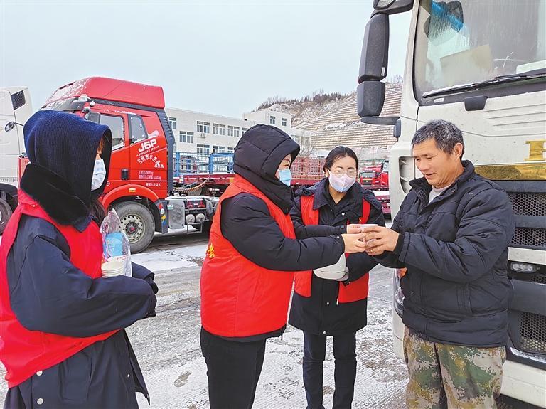 近日,甘肅省高速公路服務(wù)集團(tuán)志愿者在服務(wù)區(qū)為貨車司機(jī)“送溫暖”。華運高速公路服務(wù)區(qū)管理有限公司供圖