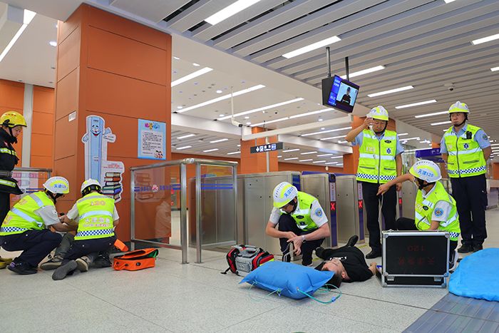 演練現(xiàn)場,模擬末端列車駕駛員室因電氣設備短路引發(fā)火情,使得列車迫停于區(qū)間,大量乘客受困于車廂內,同時因無法動車影響其他列車運行,導致學苑北路站客流積壓的事件場景。演練過程組織嚴密、緊張有序,火災警報觸發(fā)后,地鐵運營工作人員快速到達受困車廂安撫“乘客”并就近實施疏散,在引導“乘客”逃生的同時時刻關注“乘客”身體狀況,及時開展救助救援和急救措施。車站內軌道運營企業(yè)先期處置、區(qū)級應急力量參與、市指揮部指揮跨區(qū)應急聯(lián)動,車站外市消防救援總隊、市衛(wèi)健委等市指揮部成員單位和區(qū)指揮部成員單位之間協(xié)同配合聯(lián)動處置,各級預案逐步啟動,各單位、部門及時響應,對預設場景應急處置快速得當。