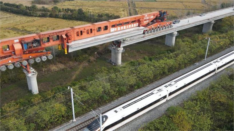 這是中國鐵建大橋局新建滬寧合高鐵箱梁架設現(xiàn)場。