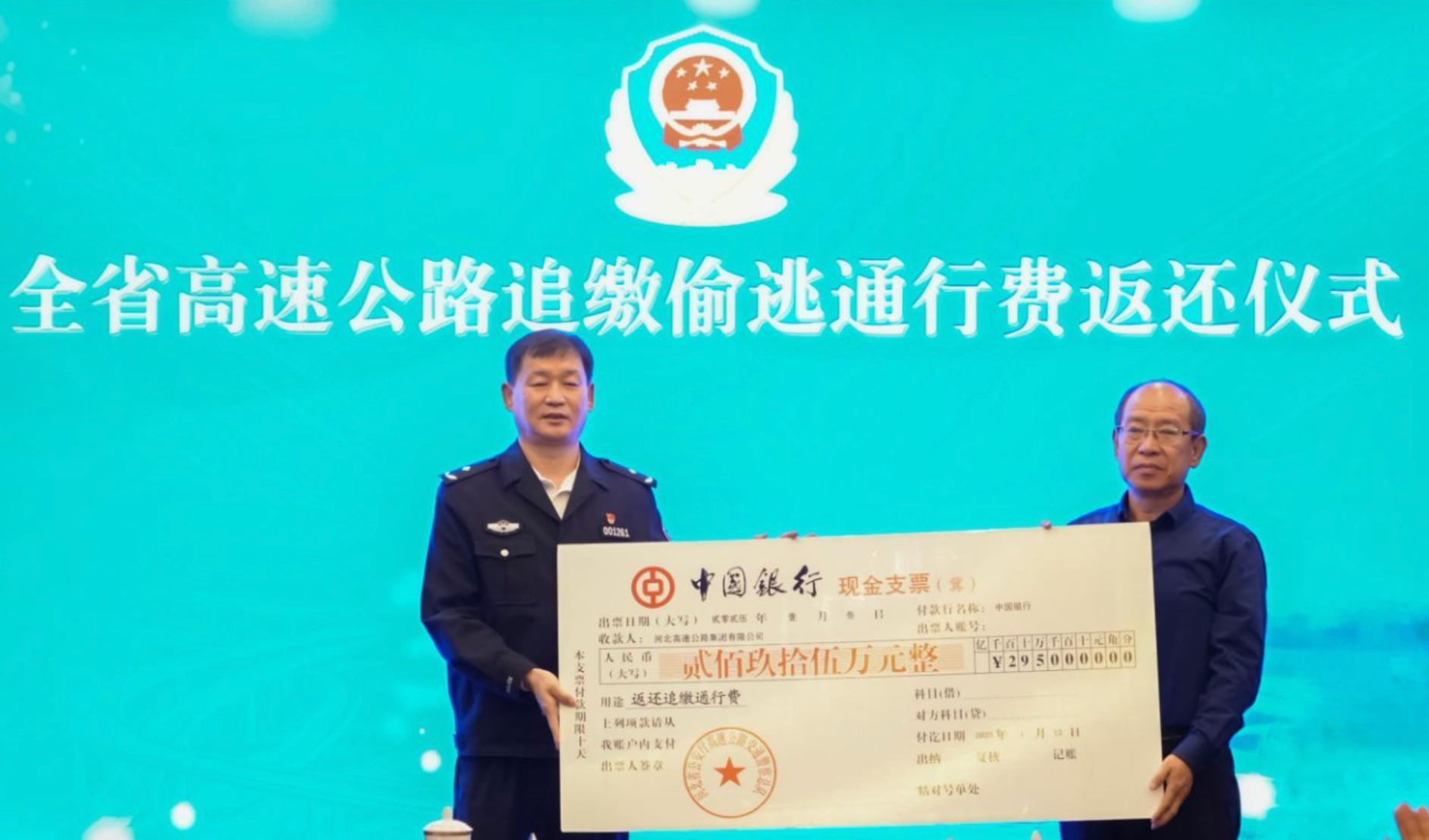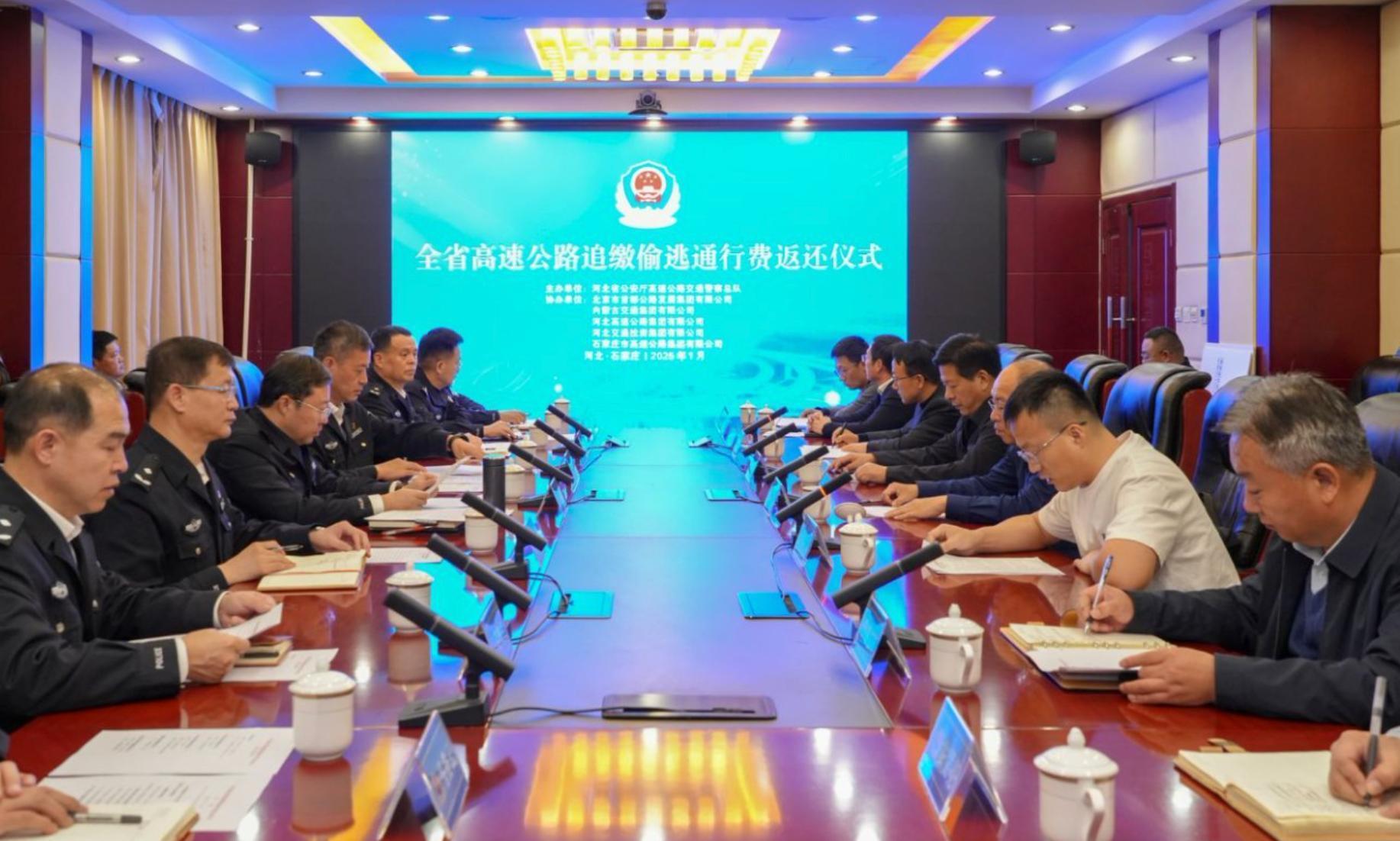 為集中展示高速交警依法刑事打擊涉交類違法犯罪專項(xiàng)行動成效,1月3日,河北省高速交警總隊(duì)舉辦全省高速公路追繳偷逃通行費(fèi)返還儀式,向河北高速集團(tuán)、河北交投集團(tuán)、北京首發(fā)集團(tuán)、內(nèi)蒙古交通集團(tuán)、石家莊市高速集團(tuán)5家業(yè)主單位返還追繳偷逃通行費(fèi)550萬元。