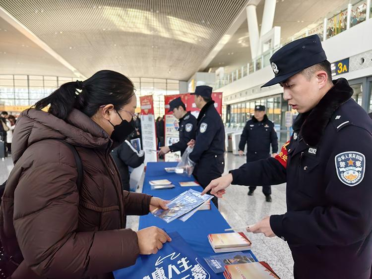 圖為民警在車(chē)站向旅客宣傳反詐常識(shí)。