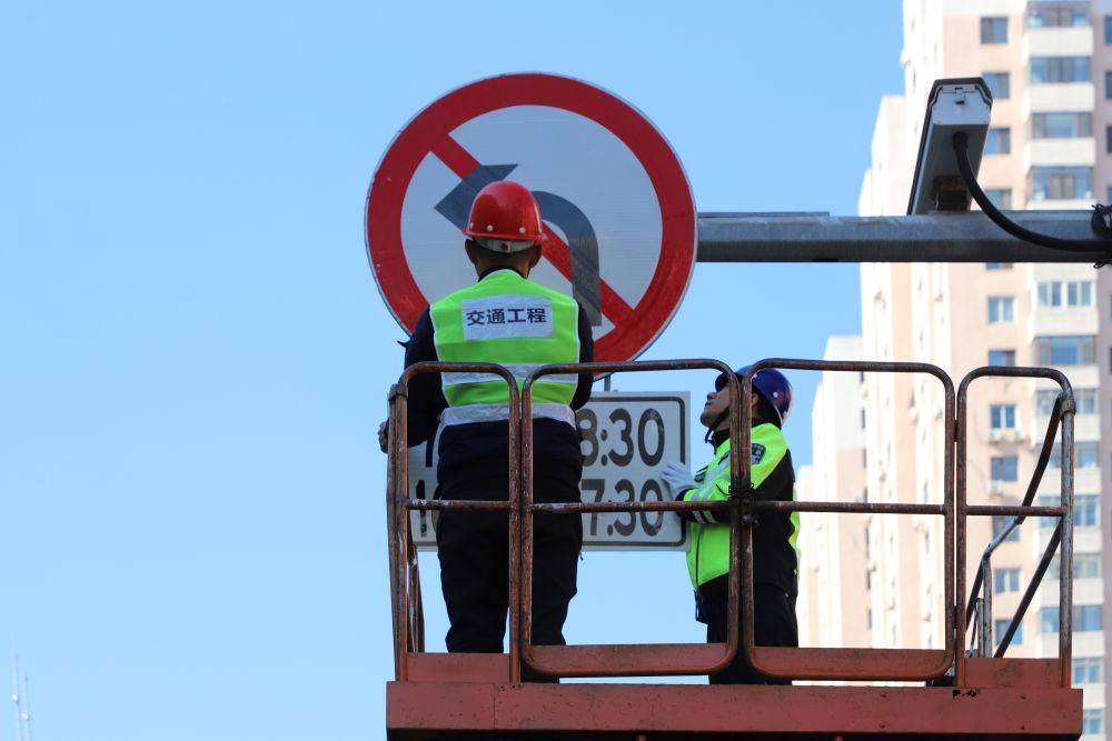 圖為本溪交警聯(lián)合相關部門對指示牌進行安裝檢查。