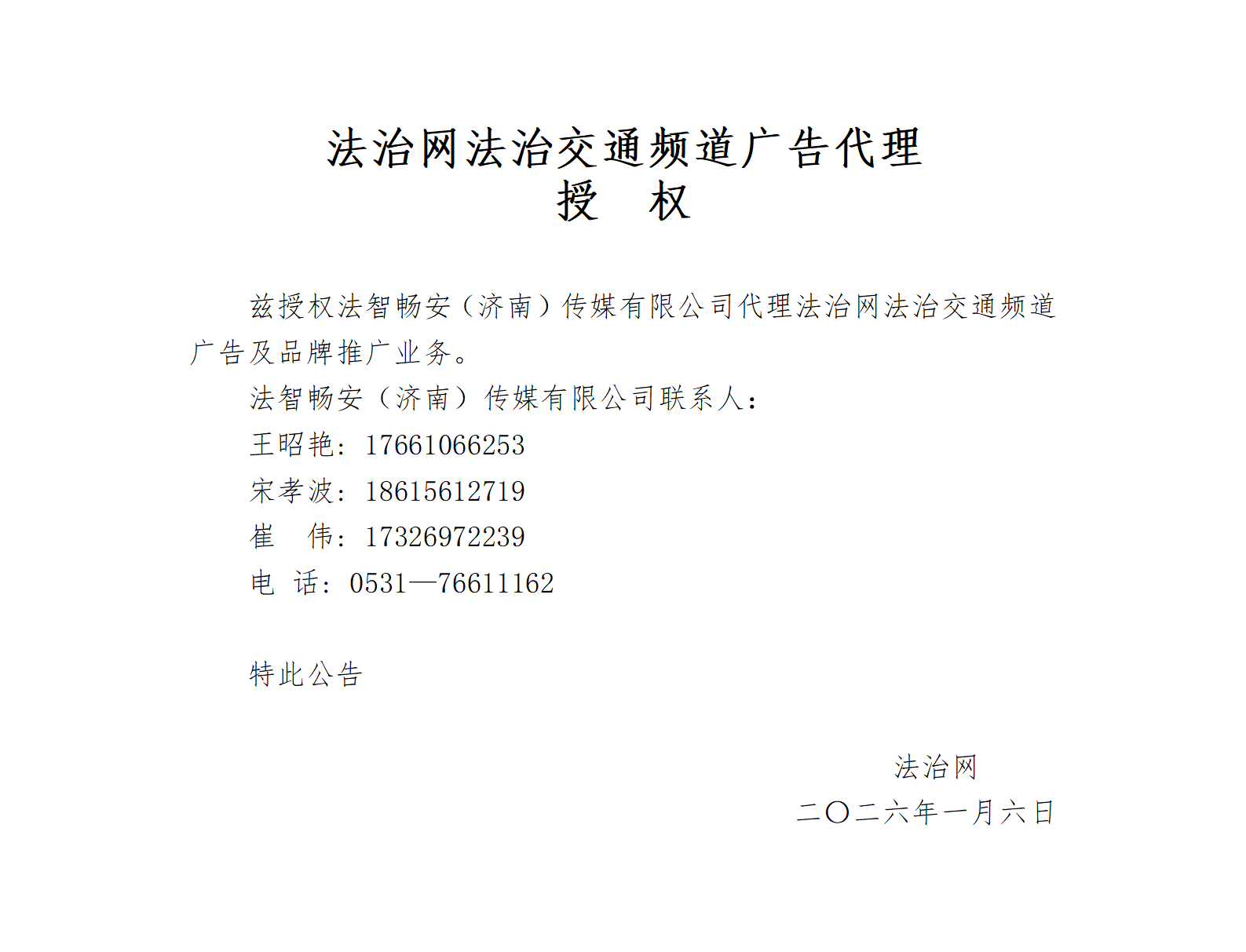 法治網(wǎng)法治交通頻道廣告代理授權(quán)
