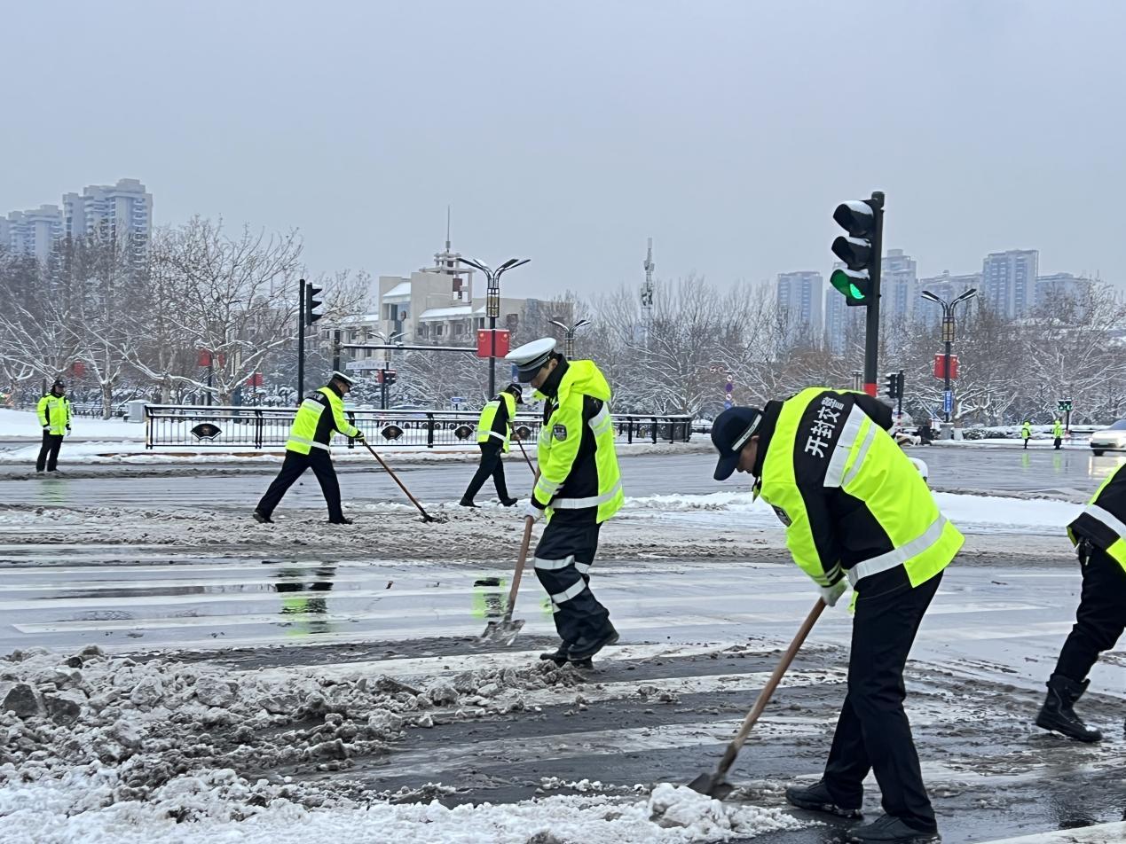 1月19日,河南省開封市遭遇大范圍強降雪天氣,道路積雪結(jié)冰給群眾出行帶來嚴峻考驗。面對惡劣天氣,開封市公安局交通管理支隊迅速啟動冰雪惡劣天氣交通應急處置預案,提前部署,強化指揮疏導和隱患排查,加強定點值守和巡邏管控,市、區(qū)、縣及高速各大隊以雪為令,聞雪而動,將警力最大限度部署在路面一線。從1月17日至1月20日,共出動警力3974人次,出動警車375輛次,設(shè)置執(zhí)勤點87處,救助群眾79人次,確保了全市道路安全、有序、暢通。