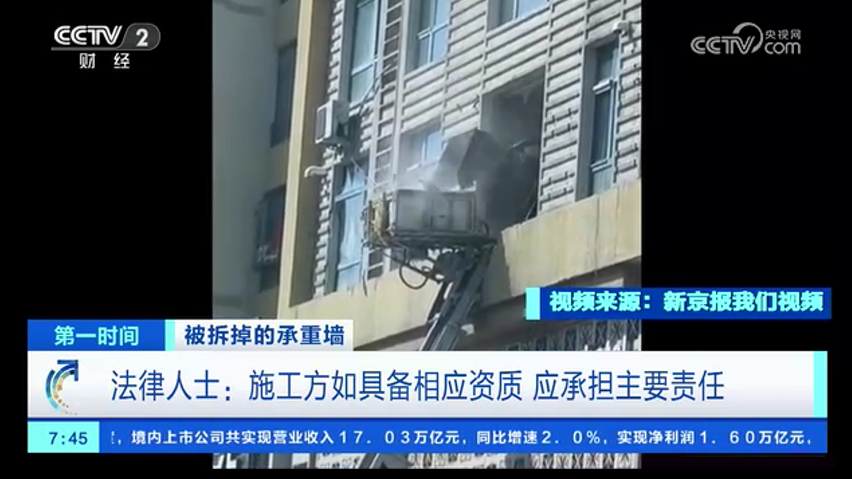 被拆掉的承重墻 法律人士:施工方如具備相應資質(zhì) 應承擔主要責任