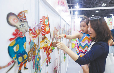 家長(zhǎng)與孩子在首屆中國(guó)(北京)動(dòng)畫周上觀看展出的皮影。陳曉根攝