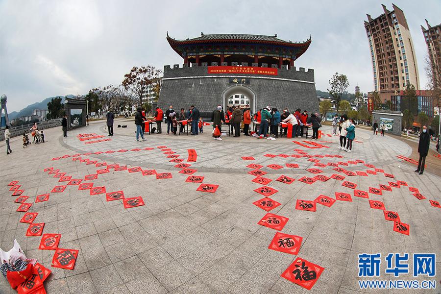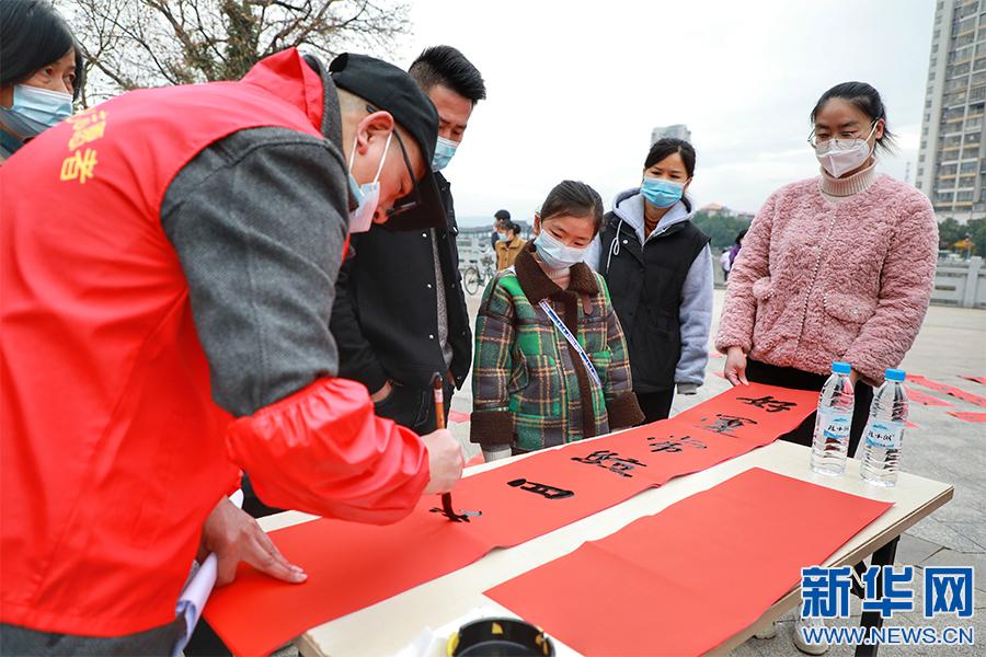 新春佳節(jié)將至,江西省贛州市全南縣組織縣書法家協(xié)會會員、書法愛好者分組深入全縣各個鄉(xiāng)鎮(zhèn)、各城市社區(qū)為群眾現(xiàn)場免費(fèi)書寫春聯(lián),送上新春的美好祝福。(譚茜予 尹其奇)