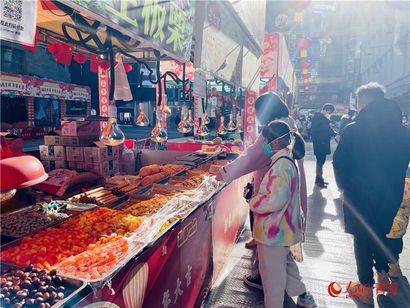力盟商業(yè)步行街是西寧市繁華熱鬧的街區(qū)之一,瓜子糖果、春聯(lián)燈籠、海鮮肉類等年貨琳瑯滿目;糖葫蘆、臭豆腐、棉花糖等各色美食香氣撲鼻,市民聚集于此,體會(huì)濃濃年味,感受城市煙火氣。