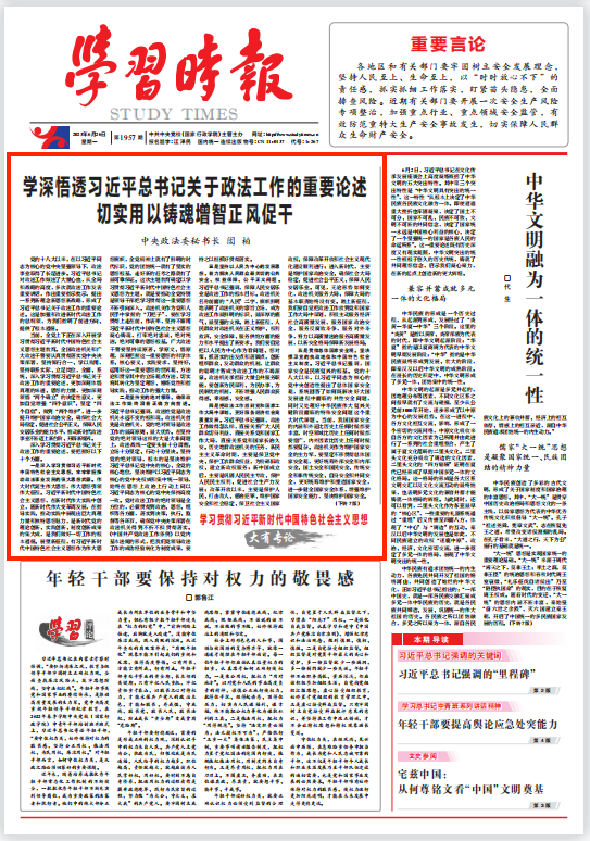 當(dāng)前,全黨上下正在深入開展學(xué)習(xí)貫徹習(xí)近平新時代中國特色社會主義思想主題教育。全國政法機關(guān)和廣大政法干警要認(rèn)真貫徹落實黨中央決策部署,堅持知行合一、學(xué)以致用,堅持聯(lián)系實際、立足崗位,全面、系統(tǒng)、深入學(xué)習(xí)貫徹習(xí)近平總書記關(guān)于政法工作的重要論述,更加深刻體悟真理的味道、思想的力量,更加深刻領(lǐng)悟“兩個確立”的決定性意義,更加自覺增強“四個意識”、堅定“四個自信”、做到“兩個維護”,進(jìn)一步提升維護國家政治安全、確保社會大局穩(wěn)定、促進(jìn)社會公平正義、保障人民安居樂業(yè)的能力水平,推動新時代政法事業(yè)不斷邁上新臺階、開辟新境界。