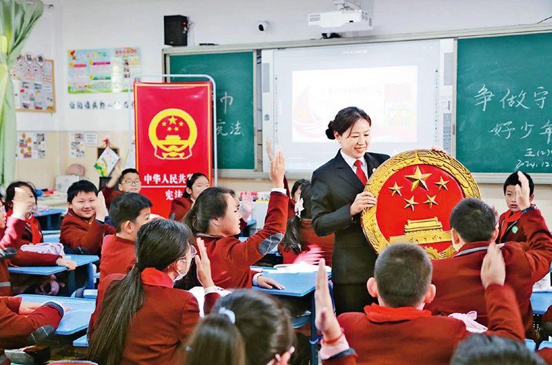 2024年12月4日是我國(guó)第十一個(gè)國(guó)家憲法日,12月1日至7日,各地開展以“大力弘揚(yáng)憲法精神,推動(dòng)進(jìn)一步全面深化改革”為主題的“憲法宣傳周”活動(dòng)。圖為12月2日,安徽省合肥市廬陽(yáng)區(qū)司法局聯(lián)合人民法院在廬陽(yáng)實(shí)驗(yàn)小學(xué)開展“憲法宣講進(jìn)校園”活動(dòng)。司法部供圖