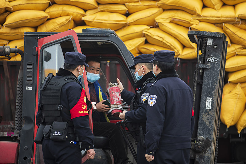 圖為民警檢查貨場(chǎng)消防設(shè)備。