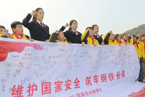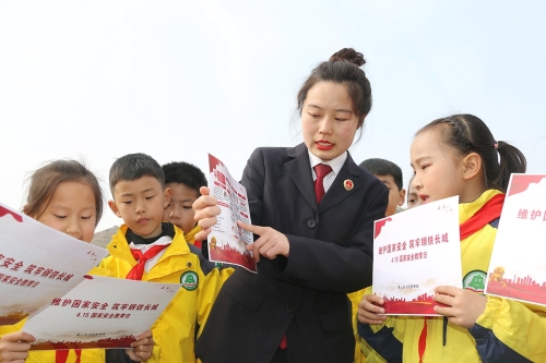 2021年4月13日,江蘇省連云港市灌云縣實驗小學(xué),檢察官在進(jìn)行“全民國家安全教育日”普法宣傳活動。國家安全日來臨,江蘇省連云港市灌云縣檢察院進(jìn)入校園開展“全民國家安全教育日”普法宣傳活動,把國家安全相關(guān)知識、維護(hù)國家安全意識以及總體國家安全觀植入學(xué)生們心中。