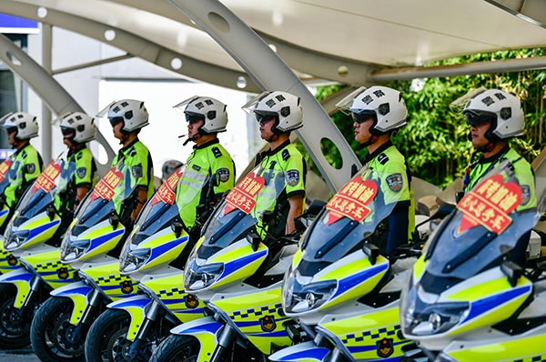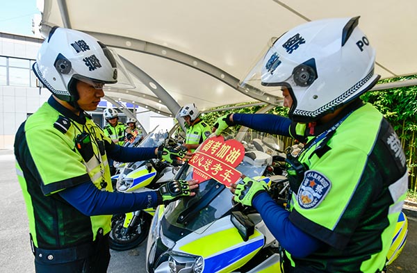 6月6日,山東省棗莊市臺(tái)兒莊公安分局交警大隊(duì)民警在車輛上粘貼愛心送考標(biāo)識(shí)。今年高考期間,山東省棗莊市臺(tái)兒莊公安分局交警大隊(duì)組織了14輛“愛心送考車”在高考考點(diǎn)疏導(dǎo)交通,處理突發(fā)事件,為考生愛心護(hù)考。