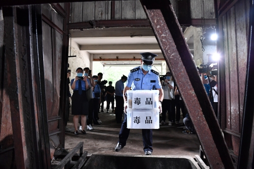 圖為民警將毒品搬送進(jìn)銷(xiāo)毀爐集中銷(xiāo)毀。