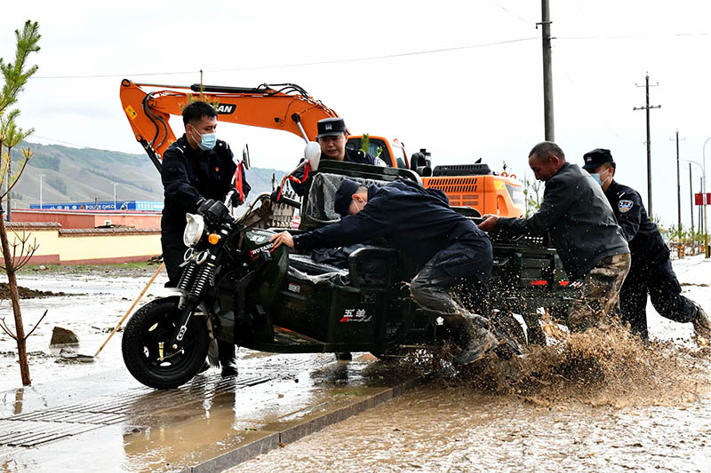 7月15日,新疆哈密市伊吾縣前山鄉(xiāng)出現(xiàn)雷雨天氣,隨后突降暴雨,17時10分許,由于降水量逐漸增大引發(fā)洪水,駐守在哈密市伊吾縣前山鄉(xiāng)的哈密邊境管理支隊伊吾邊境管理大隊前山邊境派出所立即啟動突發(fā)情況緊急預(yù)案,聯(lián)合當(dāng)?shù)剜l(xiāng)政府出動9名民警,6名輔警和15名護邊員組成“黨員突擊隊”,攜帶救援工具趕往受災(zāi)嚴重的前山鄉(xiāng)中心村開展救援。