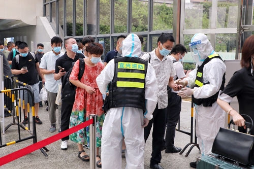 圖為7月25日,執(zhí)勤人員在宜興高鐵站對(duì)出站人員進(jìn)行疫情期間例行查驗(yàn)。