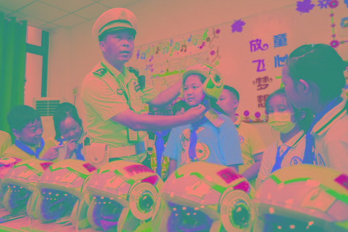 圖②:9月1日,湖北宜昌交警指導(dǎo)學(xué)生佩戴安全頭盔。許俊富 攝
