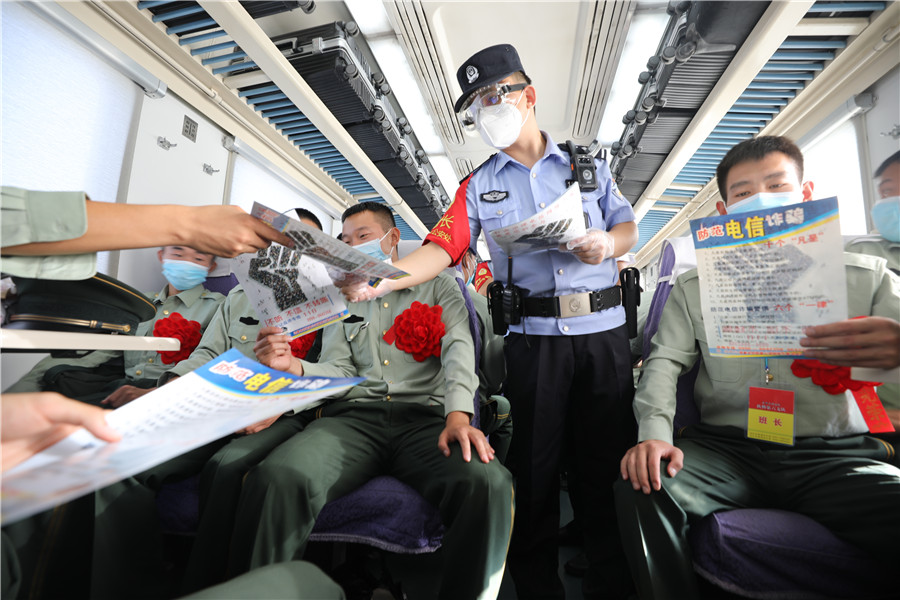9月1日,由喀什開往西安的T270次列車,迎來一批退伍士兵旅客,烏魯木齊鐵路公安局庫(kù)爾勒公安處乘警支隊(duì)值乘民警在做好列車值乘工作的同時(shí),向退伍士兵開展了防范電信網(wǎng)絡(luò)詐騙法治宣講,切實(shí)保障退伍士兵安全歸鄉(xiāng)。