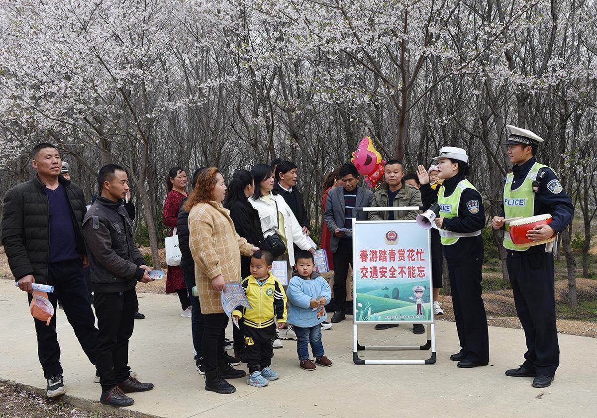 3月29日,安徽省安慶市宿松縣公安局交警大隊(duì)民輔警深入轄區(qū)櫻花園等景點(diǎn),對(duì)自駕游游客開(kāi)展交通安全提示,發(fā)放安全提示卡。圖為該大隊(duì)民輔警采取交通安全“大鼓書(shū)”的形式宣傳旅游交通安全常識(shí)。