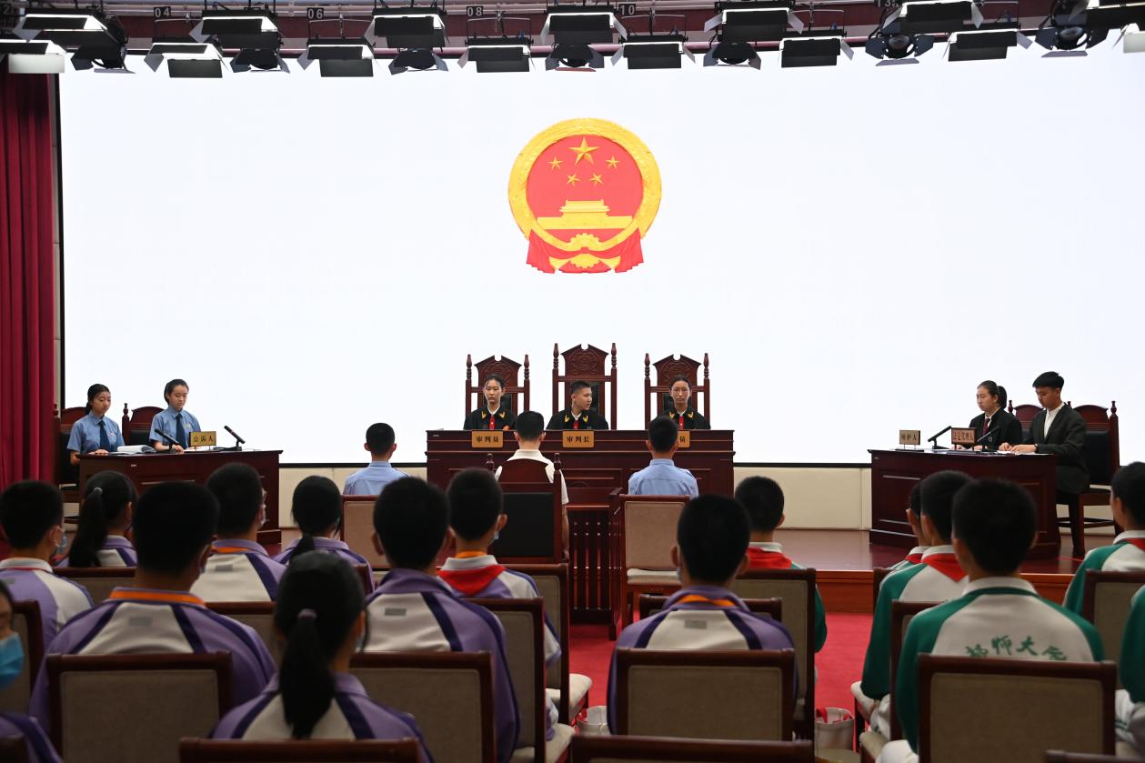 開放日活動的最后一個環(huán)節(jié)是設(shè)立小型模擬法庭,互動式體驗(yàn)法治教育。在模擬法庭中,首都師范大學(xué)附屬中學(xué)的學(xué)生周詳森和孫鈺桐分別擔(dān)任審判長和公訴人,他們穿上制服,走進(jìn)法庭,有條不紊、嚴(yán)謹(jǐn)規(guī)范地開啟了“沉浸式”體驗(yàn)。
