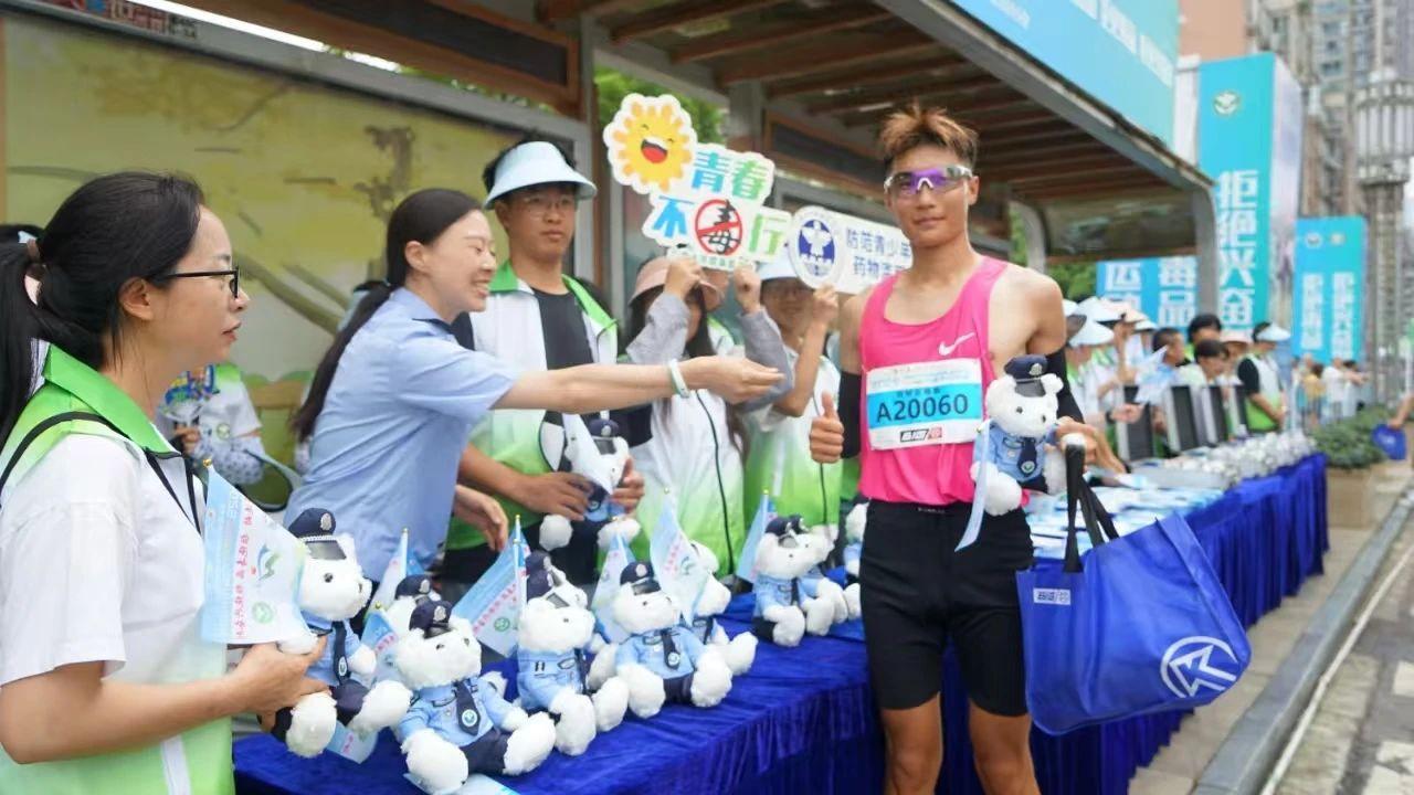 賽道上,各參賽隊(duì)伍蓄勢待發(fā),隨著開賽槍聲響起,參賽隊(duì)員與廣大跑者一起向著終點(diǎn)破風(fēng)前行,在隊(duì)伍行進(jìn)中,由禁毒民警、志愿者組成的“禁毒反興奮劑宣傳志愿服務(wù)隊(duì)”高聲呼喊禁毒和反興奮劑口號,積極傳遞全民禁毒理念。