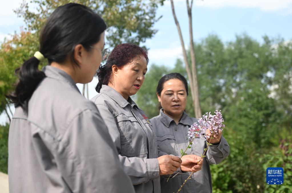 在青海省西寧市林業(yè)科學(xué)研究所的培育基地內(nèi),張錦梅(中)與同事在比較兩株丁香花束的異同(9月14日攝)。新華社記者 張龍 攝