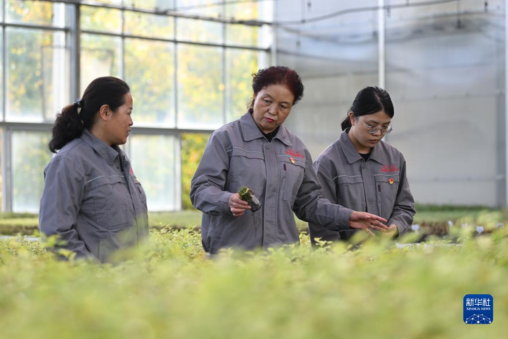 在青海省西寧市林業(yè)科學(xué)研究所的溫室內(nèi),張錦梅(中)與同事在查看種苗(9月14日攝)。新華社記者 張龍 攝