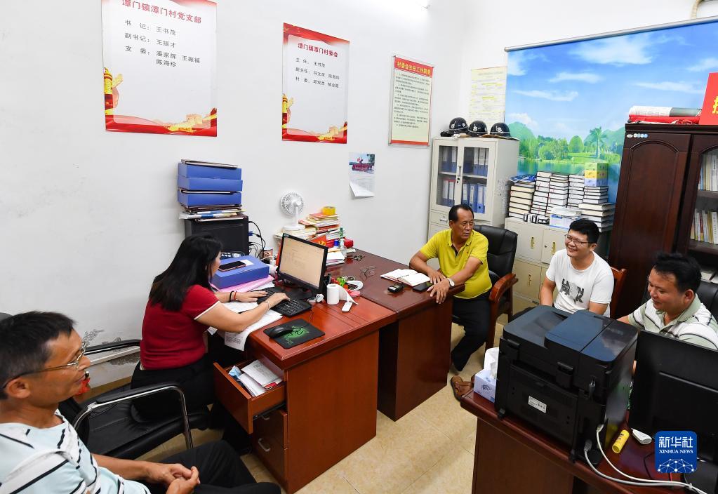 王書(shū)茂(中)在海南省瓊海市潭門(mén)鎮(zhèn)潭門(mén)村村委會(huì)辦公室同村干部討論工作(9月14日攝)。新華社記者 楊冠宇 攝