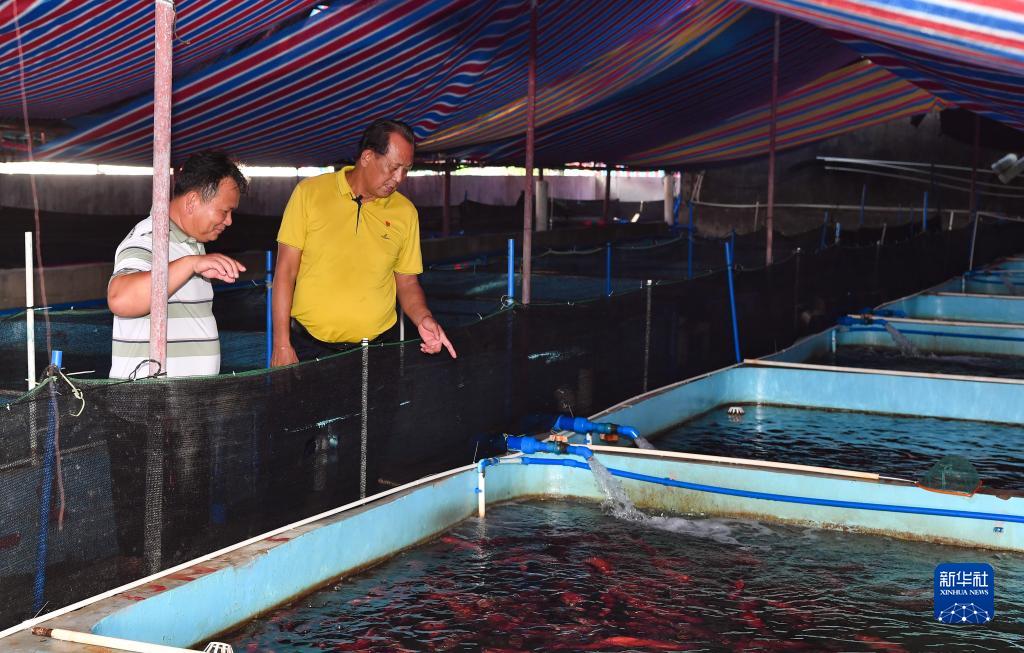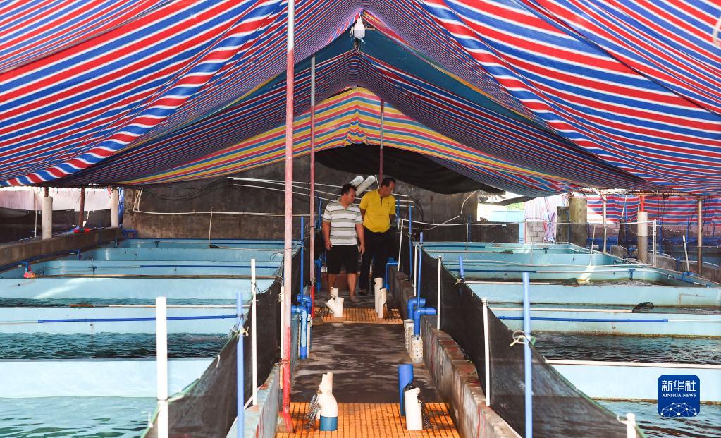 王書(shū)茂(右)在海南省瓊海市潭門(mén)鎮(zhèn)潭門(mén)村的一處養(yǎng)殖基地調(diào)研(9月14日攝)。新華社記者 楊冠宇 攝