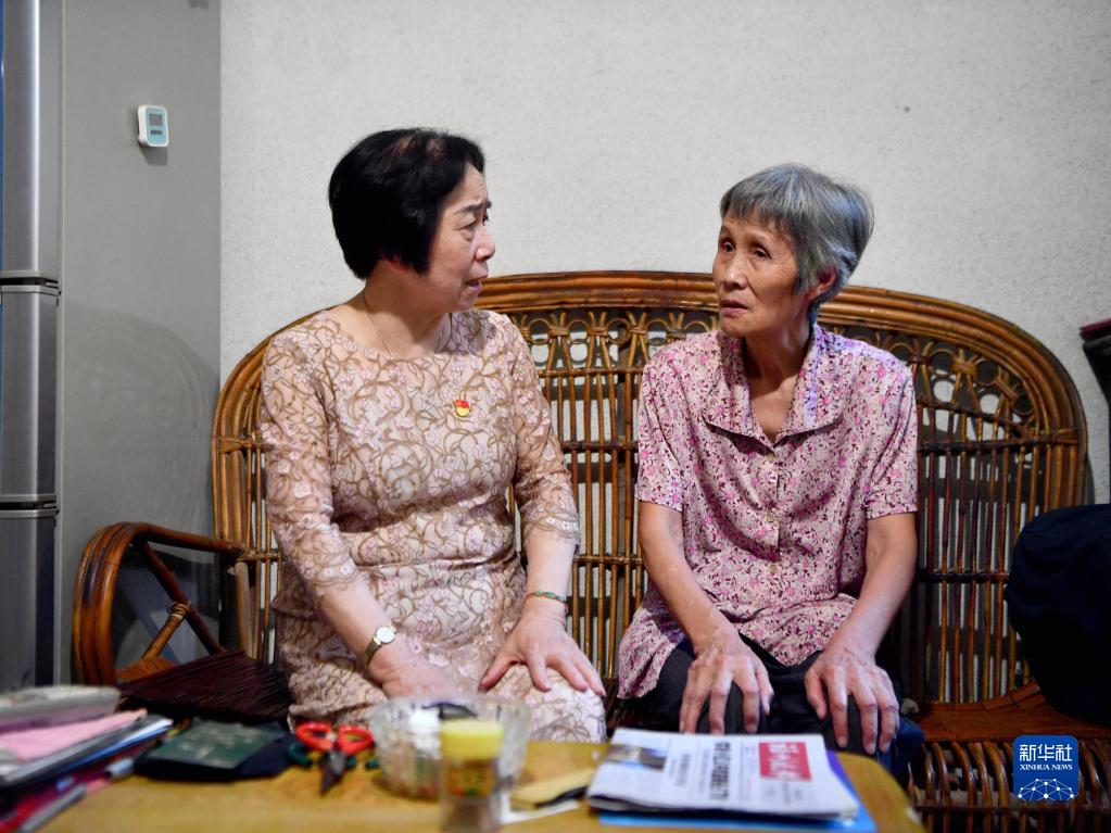 福建省福州市軍門社區(qū)黨委書(shū)記林丹(左)在居民高珠英家走訪,了解老人生活情況(2022年9月15日攝)。新華社記者 姜克紅 攝