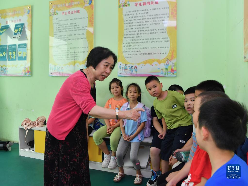 在福建省福州市軍門社區(qū)少兒托管中心,林丹與放學(xué)歸來(lái)的孩子們交流(2022年9月14日攝)。新華社記者 姜克紅 攝