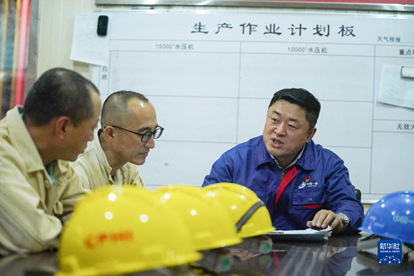劉伯鳴(右一)在廠房會(huì)議室內(nèi)與工友討論生產(chǎn)作業(yè)事項(xiàng)(2022年9月17日攝)。新華社記者 王松 攝