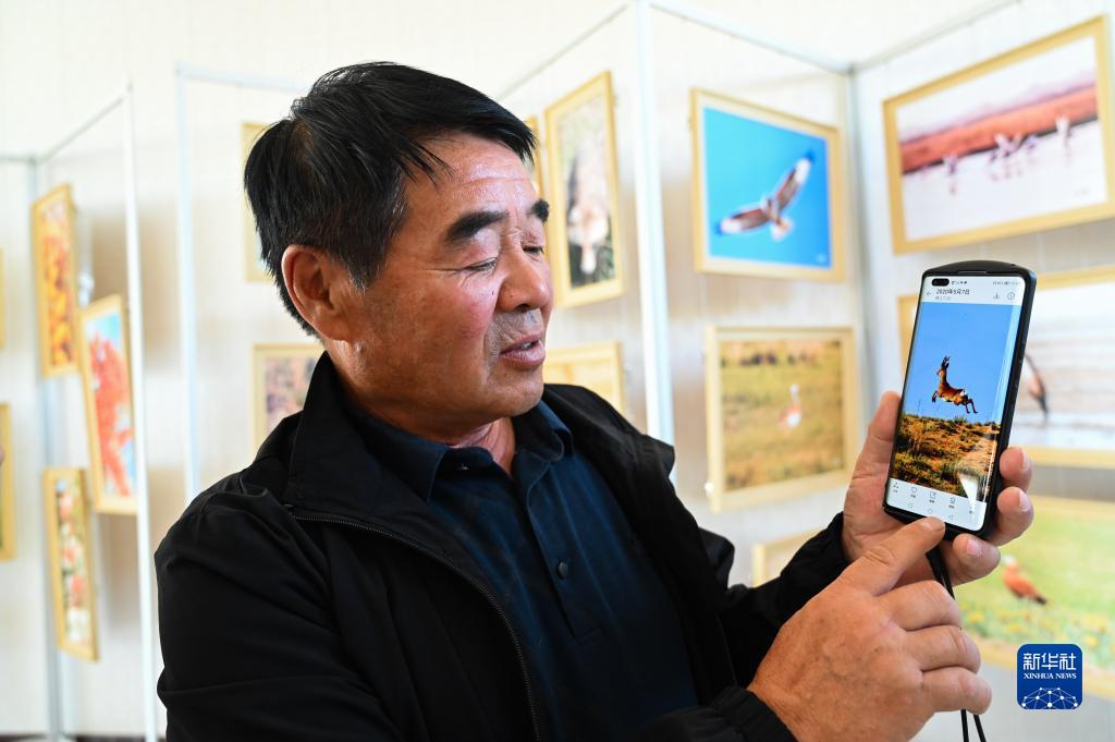 廷·巴特爾展示在自家草場(chǎng)拍攝的野生動(dòng)物(9月8日攝)。新華社記者 劉磊 攝